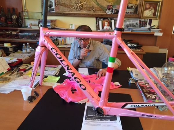 During this meeting Alessandro Colnago popped in to present a 48s Pink Colnago C60 frame to me….. I must say my first reaction was butterflies… The Giro Rosa had not started yet but there was a pink frame for Mara Abbott already prepared. The frame carried the Italian flag so I first thought it was for Elisa however, they informed me it was Mara’s size. We’re at day 6 of the Giro Rosa and Mara’s in Pink!